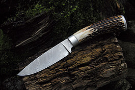 Category: hunting knifeBlade steel: hand forged stain less Damascus steelScales/hilt: sambar deer, stain less steelBlade lenght: 115mmOverall length: 228mmWeight: 203 gramSheath: leather sheathsold