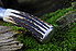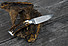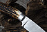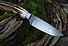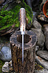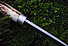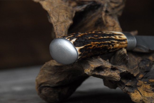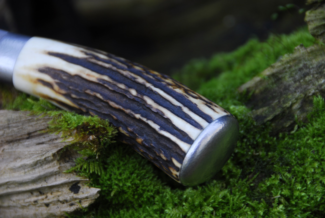 Die Zwinge und Endverschraubung sind aus rostfreien Vollmaterial selbst gefertigt und mit einer Hammerschlagoptik versehen. Als Griffmaterial habe ich ein sehr schönes Stück Sambar Hirsch verbaut, dieses Material kommt aus Indien und ist deutlich dichter als das Geweih unserer Rothirsche. Es kommt Mammut Elfenbein sehr nahe und ist ein echter Handschmeichler. Die Steckscheide besteht aus 3mm starken Blankleder, mit vertiefter Naht.