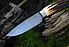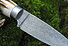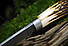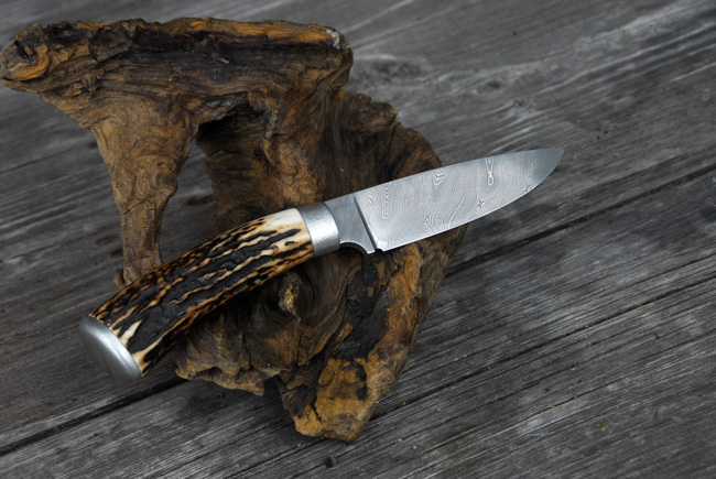 Dieses edle Jagdmesser ist im Herbst 2010 entstanden und ist mein erstes Lederhosen-Messer aus rostfreien - tordierten - Damast. Um das Leistungspotenzial des Stahles optimal zu nutzen, habe ich die Wärmebehandlung der Klinge selbst durchgeführt mit drei Tiefkühlzyklen bei - 80 Grad erreicht der Stahl eine Härte von 60 HRC. Die Angel des Messers ist durchgehend und mit der Anschlußkappe am Griffende verschraubt.